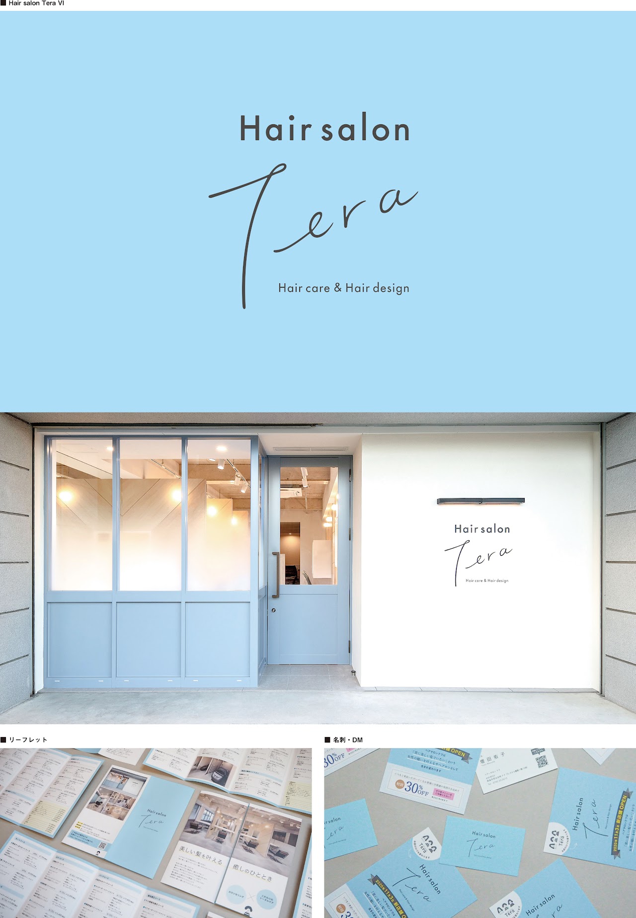 ロゴのベースの水色も綺麗でこの美容院のメインカラーに設定されており、店舗のドアやガラス戸と合わせてお洒落な感じが一杯です。